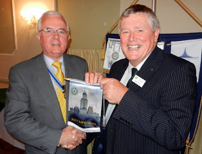 One hundred and seventeen years later that Club – affectionately known as Rotary One – still meets in Chicago and is visited by thousands of Rotarians from around the world. Our Club Secretary John Margetts recently had the opportunity to join them and to bring back one of their Club banners which he this evening presented to President John.