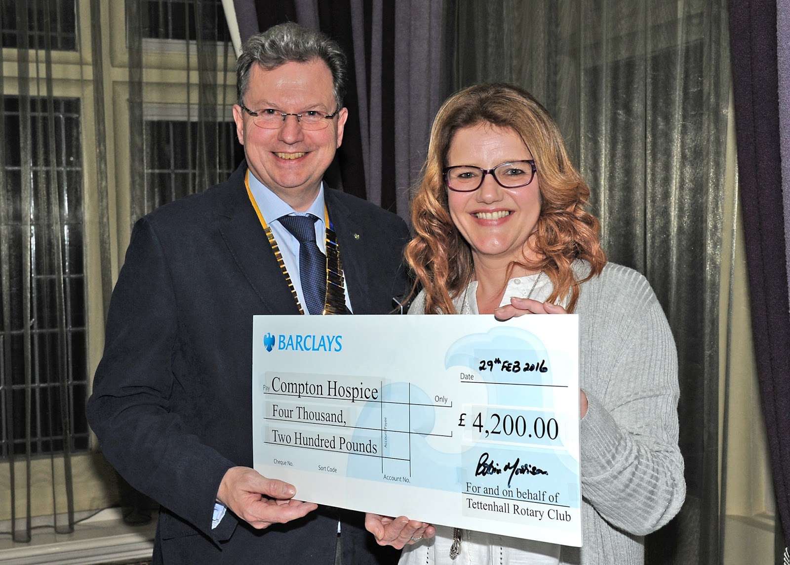 Thanks to your support over Christmas President Rob tonight presented Sally Woods of the Hospice’s fundraising team with a cheque for £4,200 which will enable the Hospice to purchase computing equipment for use as part of their new patient management system as well as upgrading their Reception call handling system to ensure that the Hospice can continue to offer an outstanding level of service to both patients and visitors.