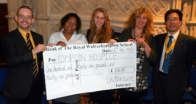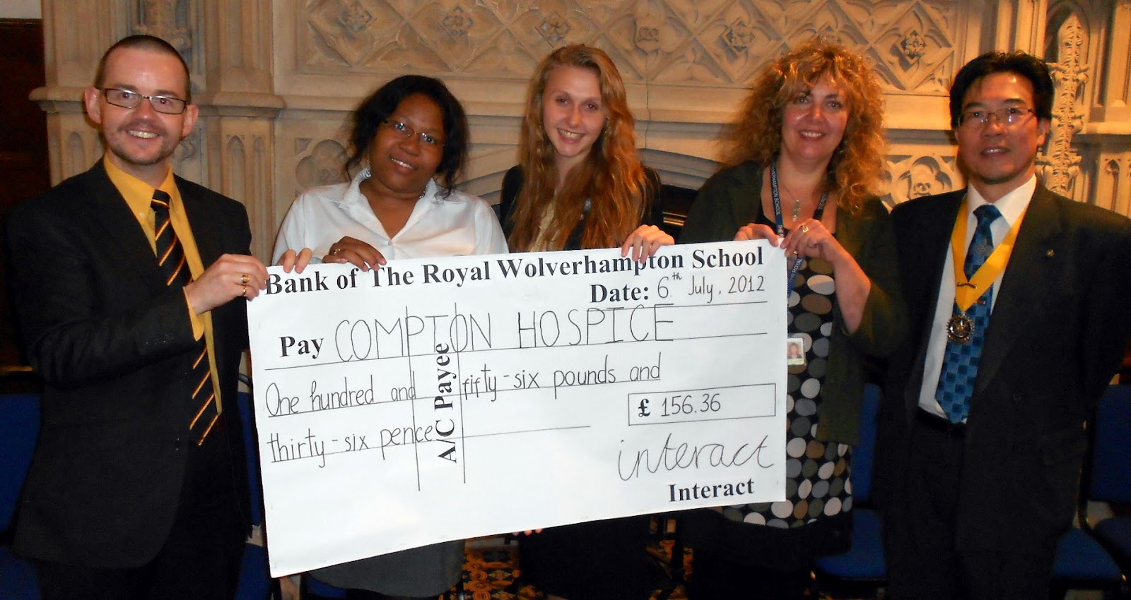 This afternoon President Elect Sammy – a Governor at the School – had the pleasure of joining President Rebecca and the other members for the Interact Club as they handed over a cheque to Compton Hospice for £156.36 which they had raised with their human fruit machine at last weekend’s Tettenhall Village Fete.